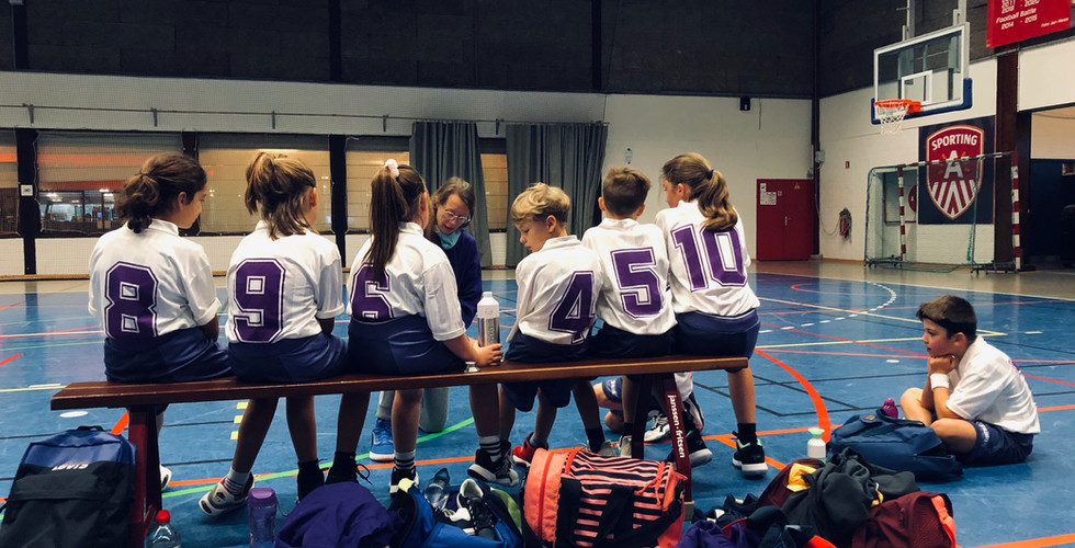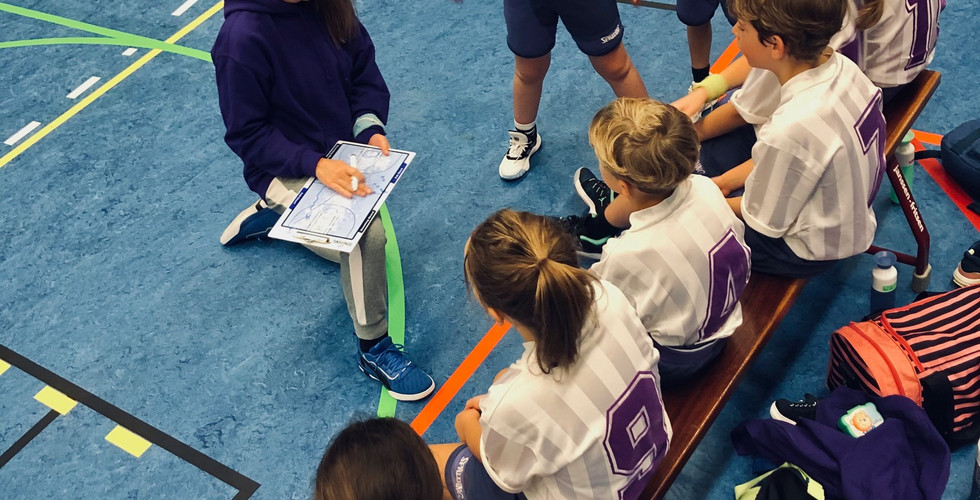 Bij de inworp maken onze mics het zichzelf iets te moeilijk door tegelijk de bal te komen vragen. Coach Veerle laat onze mics even nadenken om te zien hoe ze dit anders kunnen doen. Juist, ruimte en kijken naar elkaar !
